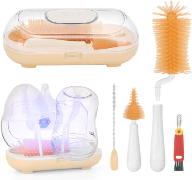 6 IN 1 Baby Travel Essentials Our silicone bottle brush set include a baby bottle brush with handle,nipple brush,straw brush,3 in 1 Cup Lid Gap Cleaning Brush Set,UV lamp & storage box.It can 360 cleaning of all kinds of bottles and cups,but also indoors and outdoors use,making the experience of parents and babies more comfortable and convenient.It is an indispensable cleaning companion for babys growth