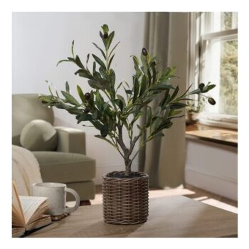 OHS Small Green Olive Tree With Olives In A Natural Woven Basket, Height: 50cm