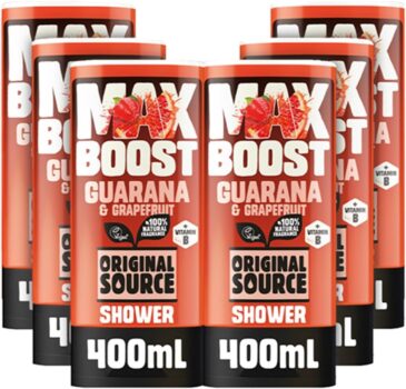 Feeling the drain Need a morning boost Turn the dial UP with NEW Original Source MAX Boost Guarana & Grapefruit Shower Gel for instant freshness A shower gel multipack with 6 bottles bursting with 100% natural fragrance to invigorate your senses Vitamin B, leaving you feeling refreshed and ready to kickstart your day. Even better, our products are tested on us, never on animals and were proud to be Vegan too.