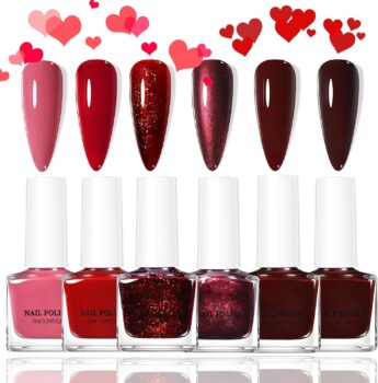 Red Nail Polish Set, 6Pcs Quick Dry Nail Varnish Kit, Burgundy Bloody Mary Red Nail Polish Gel, Christmas Shimmer Glitter Nail Art Varnish – No Need UV Nail Paint for DIY Manicure at Home