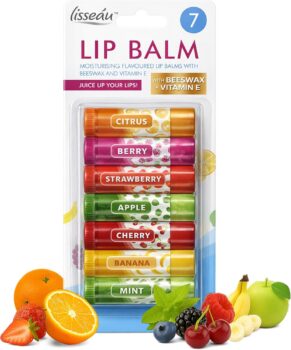 JUICE UP YOUR LIPS Enjoy flavoured lip balms that help keep lips moisturised and protected. Includes 7 fruity options: Banana, Strawberry, Cherry, Berry, Citrus, Apple & Mint. Flavour and scent may feel light and can vary by person.