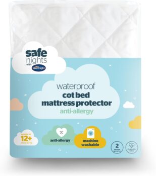 Silentnight safe nights can proudly present our new quilted waterproof cot bed mattress protector. keep your child fresh and dry for a perfect nights sleep and for extra comfort, the protector features a soft quilted top with waterproof backing and has a deep fitted skirt for a secure fit. hypo-allergenic and waterproof, this mattress protector is ideal for little ones, giving you the extra peace of mind when it comes to your childs bedtime.