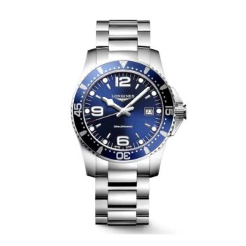 Inspired by the world of water sports, the Longines HydroConquest combines bold design with exceptional performance. The 41mm stainless steel case is paired with a matching bracelet and features a striking blue dial, protected by a unidirectional rotating bezel for professional dive timing. Engineered for reliability, the watch offers water resistance up to 300 metres, with a screw-down crown and case back ensuring durability both in and out of the water.