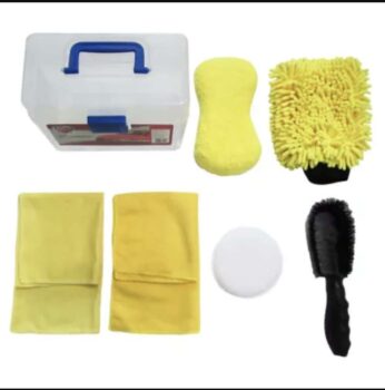 About this product: 1 x microfobre sponge, 1 x microfibre wash mitt, 1 x microfibre cleaning cloth, 1 x microfibre polishing cloth, 1 x wheel brush, 1 x wax pad, 1 x plastic box. Care instructions: Machine wash cloth with mild detergent at 40C. Wash separately. Do not use fabric softener or bleach. Allow to dry naturally. Warning: Microfibre will not scratch surfaces but does trap particles that may scratch. To prevent surfaces being scratched always rinse your sponge before each use.
