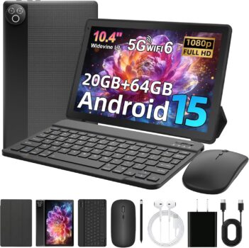 Android 15 Tablet, 10.4 inch Tablet, Android Tablets with Keyboard Pen Case Mouse Earphone, 20GB RAM64GB ROM (TF 1TB), 5000mAh, WiFi 6, BT5.4, Dual Cameras & Speakers, Black