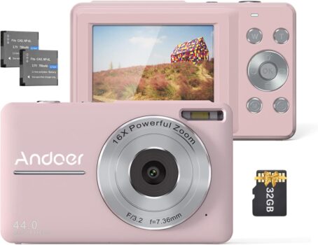 Andor Digital Camera, 32GB Memory Card, 1080P Portable Mini Camera, 44MP, 2.45-inch IPS Display, 16x Digital Zoom, Comes with 2 Batteries, Perfect Kids Camera for Holiday Vlog Shooting – Pink.