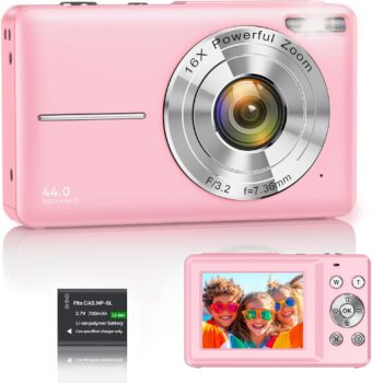 44MP IMAGE & 1080P FHD VIDEOCapture lifes precious moments in stunning clarity. This digital camera features a 44MP resolution for crisp photos and 1080P Full HD for smooth video recording. With the 16X digital zoom, you can easily magnify distant scenery, making it an ideal vlogging camera for kids, teens, and beginners to explore their creativity.