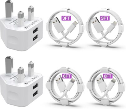 Dual iPhone Plug and Cable: AYNGWRNB iPhone charger with UK plug that includes 2 USB ports, allows you to plug in 2 devices at the same time. This iPhone charger adapter comes with smart IC technology, and charger cable supports up to 5.0V-2.4A fast charging so you only need one charger to charge your iPhone and iPad simultaneously