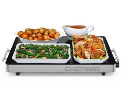 – This 450 W Chefman warming tray keeps dishes and plates warm and ready to serve