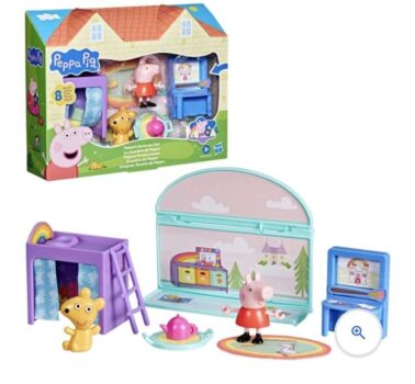 Peppa has her own room Get ready for storytelling fun with the Peppa Pig Peppas Bedroom Set. Featuring a 7.5 cm Peppa figure and self-standing backdrop, set up Peppas rainbow bunk bed with detachable ladder, and put down her rainbow rug just as shown on tv