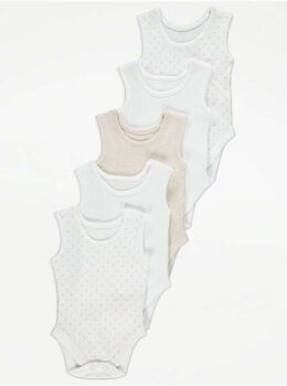 Product description 5 pack Assorted designs Press stud fastenings Scoop neck Sleeveless