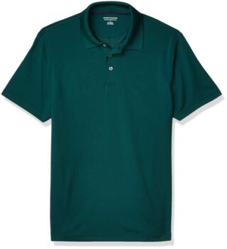 An Amazon brand – This slim-fit golf polo shirt is crafted from a quick-dry moisture-wicking knit and features three button placket and open-bottom hem