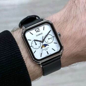 The Casio MTP-M305L-7A stands out with its radiant white dial accented by an intricate moon phase display, embodying elegance and functionality. Crafted with a sleek stainless steel case and complemented by a genuine leather strap, it offers both comfort and sophistication. Multifunction sub-dials efficiently track the day and date, ensuring practicality meets style. Perfect for those who appreciate timeless design paired with dependable quartz accuracy.