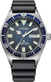 Ready for all your diving adventures, this Citizen Promaster Diver Automatic is a bold design thats packed with features. Styled here with a blue gradient textured dial with luminous hands and markers for easy visibility underwater and a black polyurethane strap for maximum comfort. In addition, this ISO-Compliant divers watch features a one-way rotating elapsed time bezel, 40-hour power reserve, screw-down case and crown, day/date display and water resistance to 200 metres.