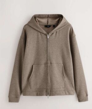 Embrace ultimate comfort with this super-soft, zip-through hoodie. Coming in a neutral stone, its velour lining offers extra warmth and a luxurious feel, making it the perfect piece for cosy layering. The drawstring hood and front pockets add a practical touch to this effortless casual staple.