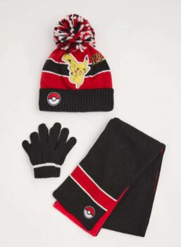 Product description 3 piece set Bobble hat Matching scarf Black gloves Pokemon design Soft knitted fabric