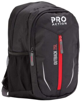 The ProAction 25L backpack has a spacious main compartment with enough space for your laptop, iPad and other accessories, making it the perfect cross over backpack. You can store your water bottle in the two side mesh pockets. Reflective prints make sure youre seen at night. The 2 front zip pockets allow for further organisation. Carry the Crossover 25L Daypack with the top handle, or wear with the shoulder straps. The padded back panel provides improved impact cushioning. Made with durable diamond ripstop polyester.