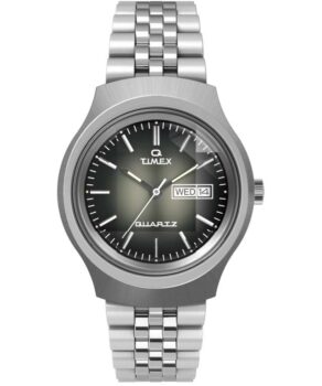 Our Q Timex Reissue Dégradé is a stunning homage to one of our most iconic Q models from the late 70s. It remains faithful to the original design with a unique domed acrylic crystal boasting intricate interior facets that catch and refract light to produce a captivating illusion of depth and texture. As light hits the lustrous dégradé dial, a beautiful, complex display of smoky color is revealed. Its allure extends further with a sleek 38mm brushed stainless-steel case, matching stainless-steel bracelet, and a day and date window as the third hour marker. Keeping with its Q heritage, this timepiece boasts the precision of a quartz movement, ensuring impeccable accuracy for those on the move.