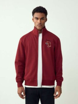 Make a statement with this smart casual zip-through sweat top in a rich burgundy hue. It features a unique, eye-catching embroidered abstract design on the back and a matching smaller detail on the chest. Perfect for elevated weekend looks, this top effortlessly combines comfort with artistic flair.