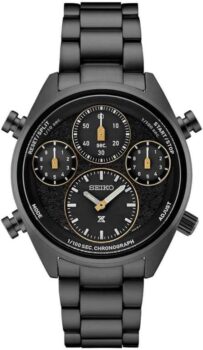 The Seiko Prospex Speedtimer SFJ007P1 features a 42mm stainless steel case, black dial with multiple chronograph sub-dials, and curved sapphire crystal. Powered by solar quartz Calibre 8A50, it times to 1/100th of a second with a 6-month reserve. Water resistant to 100m, it comes in official Seiko packaging with a 2-year warranty.