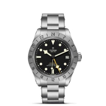 The TUDOR Black Bay Pro reflects the heritage of instruments used by the pioneering explorers,and as such is a tool-watch designed for professional use. The reference time on this watch is indicated by an angular yellow Snowflake hand which completes a lap of the dial every 24 hours. The local time is indicated by a shorter Snowflake hand set by a jumping hour,which can be moved either backwards or forwards. The date is coupled with the local time hand so that when setting the time and passing midnight in retrograde,it instantly jumps to the previous day.
