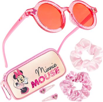 Experience the magic of Disney with our girls sunglasses and hair accessories set. Featuring 100% UV protection, these sunglasses ensure safety while adding style to any outfit. Complete with 2 scrunchies, 2 hair clips, and a charming travel case with a removable carabiner clip that can be easily attached to a trouser loop or backpack. See images for more features and details.