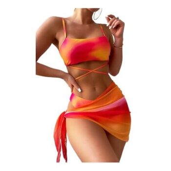 Fdsmall Womens 3-Piece Tie-Dye Bikini Set with Skirt, Orange