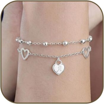 Initial Bracelet for Women Girls S925 Sterling Silver Letter A-Z Heart Pendant Layered Bracelet Christmas Birthday Gifts for Girls Daughter Sister Friends Jewellery