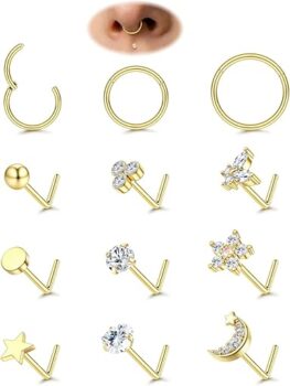 JeweBella 12Pcs 18G/20G Nose Ring Nose Stud Surgical Steel Clicker Nose Septum Rings Hoops Ball CZ Star Heart L Shaped Nose Studs Silver Gold Nose Piercing Jewellery