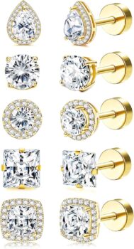 Kakonia 5 Pairs Stud Earrings for Women Silver Gold Ear Studs Hypoallergenic Surgical Steel Flat Back Cartilage Helix Earrings Studs Cubic Zirconia Small Diamond Earrings for Women Men 20G/18G