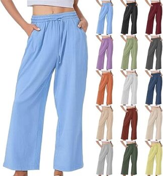 Linen Trousers Womens Casual Summer Loose Fit Lounge Pants with Pockets Fashion Elastic Waist Wide Leg Boho Ladies Cropped Trouser for Beach Holiday Wear