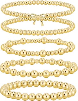TINGN 5Pcs 14K Gold Plated Bracelet for Women Stretch Beaded Bracelets Layered Cross/Double Circle/Bow/Heart/Wave-Shaped Gold Tone Bracelets Adjustable Bracelet Jewellery Gifts for Women Girls