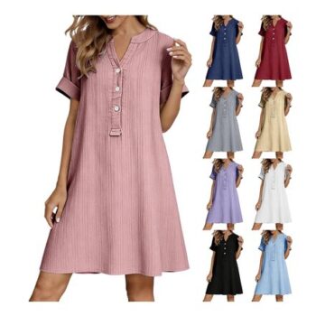 V-Neck Button-down A-Line Sundress, Short Sleeve, Cotton Linen