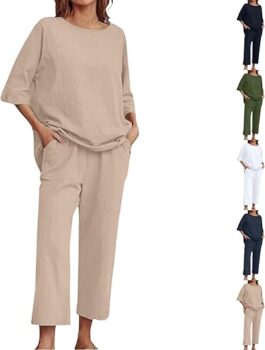 Womens Summer 2 Piece Outfits Linen Co Ords Sets Loose Fit Round Neck 3/4 Sleeve T-Shirt Solid Cotton Linen Tops and Pants Casual Trousers Plus Size Loungewear