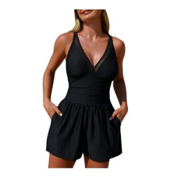 Womens V-Neck Wrap Swimsuit with Integrated Shorts, Pockets, Soft Skirt