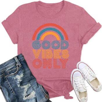 Womens Vintage Rainbow Good Vibe Only T Shirts Positive Quote Shirt Inspirational Tee Tops