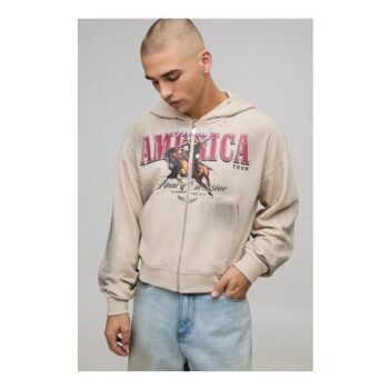 Man Stone Shrunken Fit America Western Distressed Washed Printed Zip