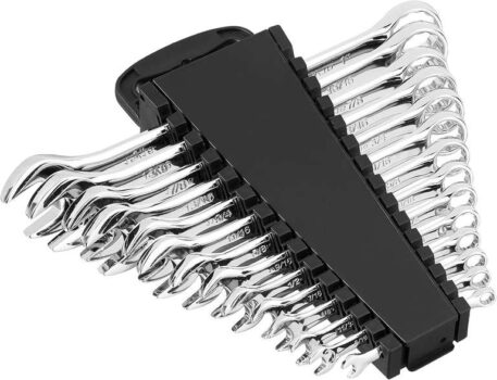 Includes wrench holder with space-saving folding handle and non-slip grippers to lock in wrenches