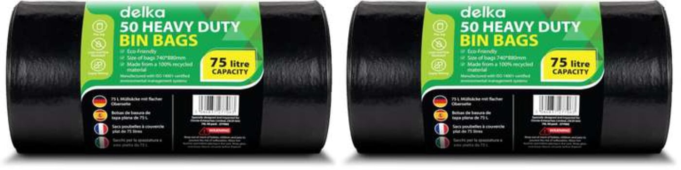 Size, Dimensions and Capacity: Delka black bags heavy duty are 30 microns Large size with 50 bags. These garbage bin bags can be used on your bin to collect rubbish waste of 75L. These bin bags can lift garbage rubbish waste up to 25Kg without failing & tearing. Please measure your bin before buying this product.