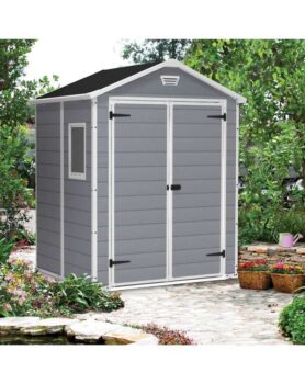 The Manor 6×5 garden shed is an elegant yet durable outdoor storage shed. Made of innovative lightweight panels H shaped, double- wall structure constructed to provide extra strength to withstand heavy duty weather and are built to last. The Manor 6×5 is a maintenance- free shed, no varnish or paint is needed. It features wide double doors for easy access, integral floor panel and ventilation that keeps your stored items clean and dry, two Victorian windows for lots of natural light, a ceiling that is high enough to let you move around with ease and is lockable for extra safety and secure. Constructed with Polypropylene. Suitable for outdoor use.