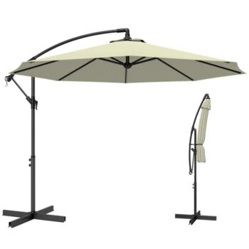Credit Chanchi32 for the code Shaded: Crafted from 180 gsm fade-resistant polyester, this large garden parasol with base included provides UPF30 sun protection. Top vent: Allows air to pass through the bottom of the banana parasol to the outside, helping to prevent it lifting up and overpowering it Crank handle: Easy to use, opens and closes the garden umbrella parasol canopy quickly and smoothly. Adjustable angle is easy to adjust and fix to different positions Stable: Its powder coated pole with cross base and 8 metal ribs are designed to resist rust, ensuring durability Dimensions: 250H x Φ295 cm. Pole: 4.8 cm diameter. Assembly required – do not use umbrella during strong winds heavy rain or snow. Cross base included. Weights required