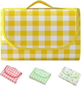 Eastrise 200x200cm Waterproof Picnic Blanket, Machine Washable, Foldable with Integrated Handle for Easy Storage and Portable Travel, Ideal for Camping and Family Outings(Yellow Check)