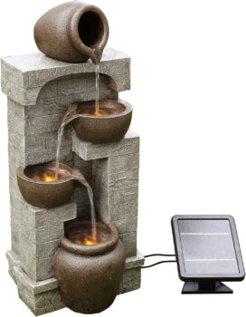 GARDEN WATER FOUNTAIN: Relax to the calm whisper of water flow and the soft glow of the warm LED lights with this unique, outdoor solar fountain. Water spills from the top and flows down to create a gentle presence with the soothing sounds of water. Eco friendly and energy efficient making this water feature a great addition to your indoor or outdoor space. Water Capacity: 7.5 Litres.