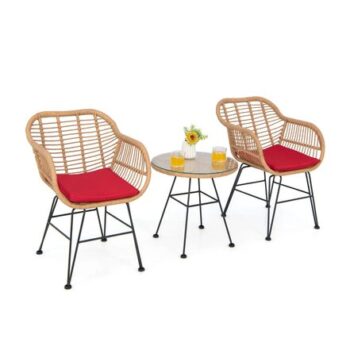 3 Pieces Patio Bistro Set Outdoor PE Rattan Armchairs w/Tempered Glass Table