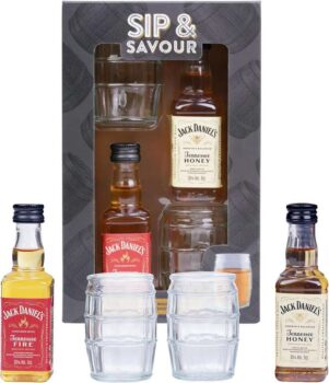 5cl Jack Daniels Tennessee Fire Whiskey (35% ABV) & 5cl Jack Daniels Tennessee Honey Whiskey (35% ABV) with 2 Mini Barrel Shot Glasses Gift Set