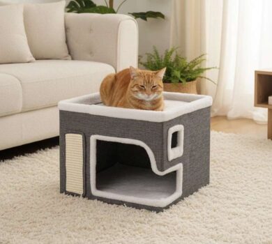 Spoil your feline friend with our 2-in-1 cat house This clever design features a dual-level structure with a spacious, open cat bed on top and a cosy, semi-enclosed hideaway condo below.