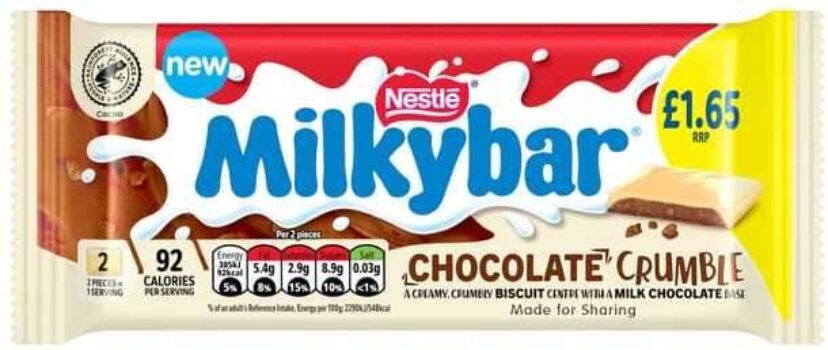 Milkybar Chocolate Crumble, with a creamy vanilla biscuit centre on a milk chocolate base, all wrapped in smooth white chocolate