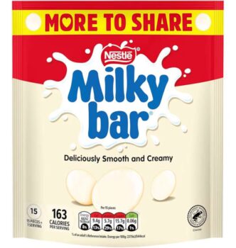 Milkybar Sharing Bags, why not try our creamy Milkybar Blocks.. 176g sharing bag of Milkybar creamy white chocolate giant buttons. At Milkybar we love to keep it simple, nothing but great, creamy tasting smooth white chocolate. From bars to blocks to Giant buttons, its the same delicious taste that you and your family know and love Pure and Simple, no artificial nasties – just the unmistakable taste of Milkybars white chocolate. No wonder we are the nations favourite white chocolate brand. Rainforest Alliance Certified cocoa . Giant white chocolate buttons made from Milkybar chocolate. Great for sharing with family or friends. The Nations favourite white chocolate brand. 176g sharing bag of Milkybar creamy white chocolate giant buttons.. No artificial colours, flavours or preservatives. Milkybar.