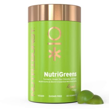 Nutriburst – NutriGreens – 22 Fruits Vegetables Herbs Mushrooms Live Bacteria Cultures – Boosted with Vitamins: Zinc, VIT C, D3, B5, B6, B12-60 Gummies 1 Month Supply – Suitable for Vegans