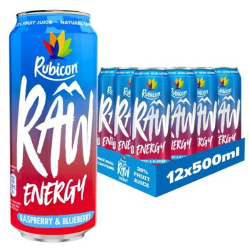 Rubicon RAW 12 Pack Raspberry & Blueberry 500ml Energy Drink, 20% Real Fruit Juice, High caffeine with B-Vitamins, Ginseng & Guarana, No Artificial Colours or Flavours, Reduce Tiredness & Boost Energy